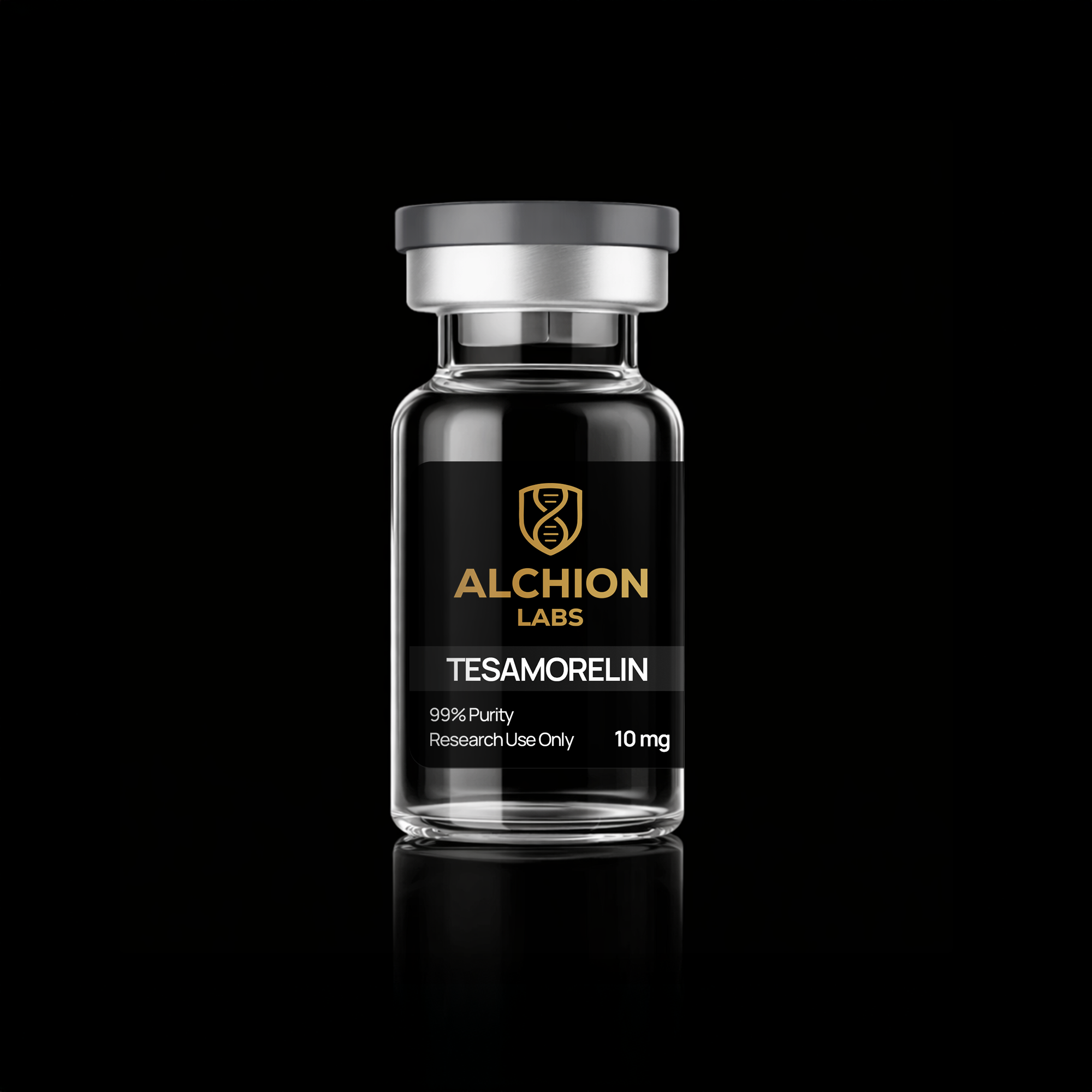 Tesamorelin in a 10 mg vial. Intended for laboratory research use only. Not for human consumption.